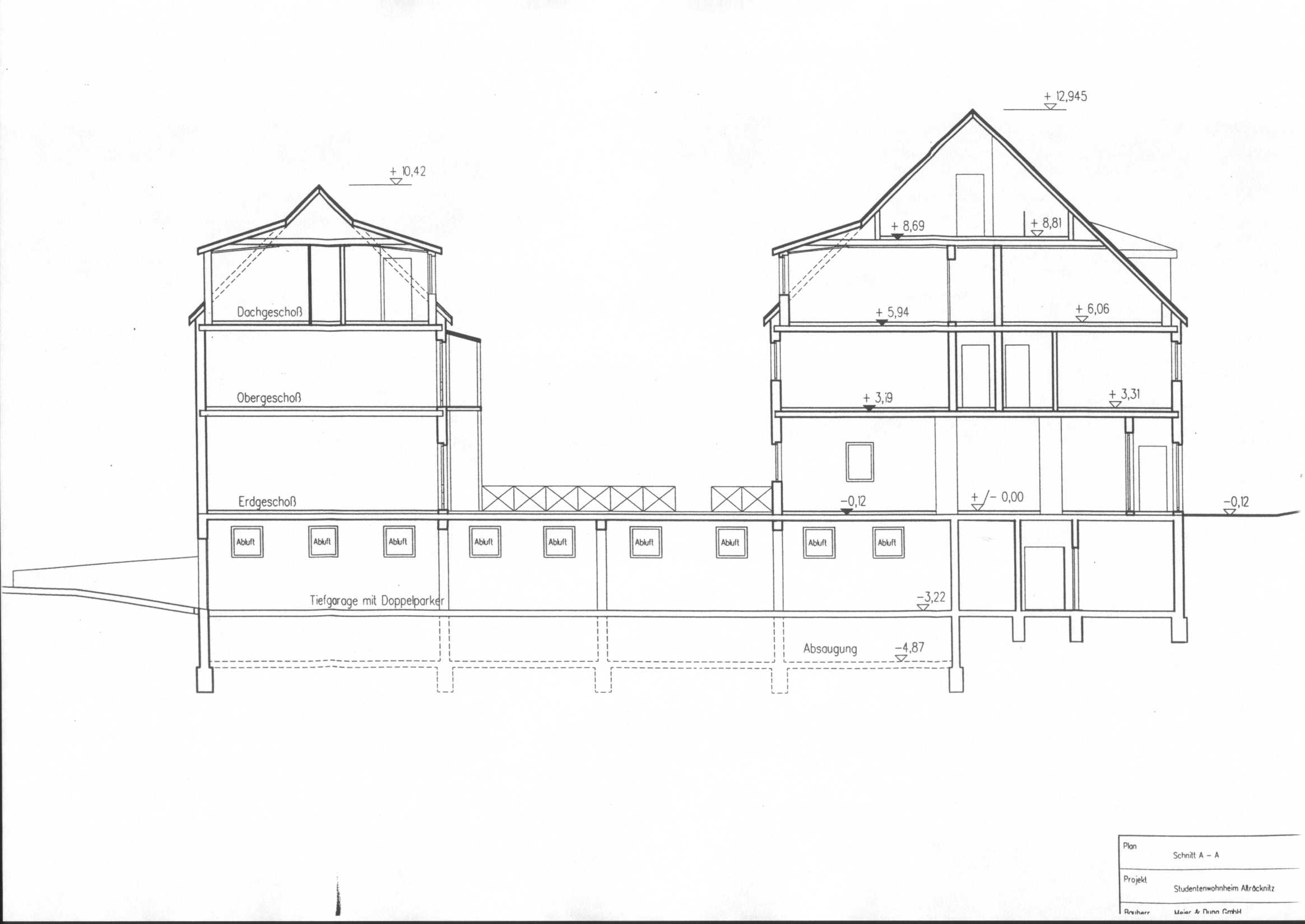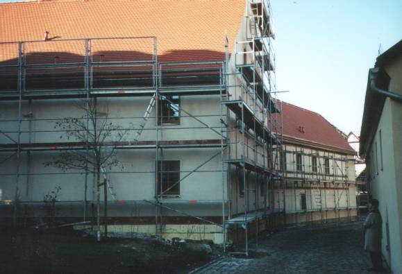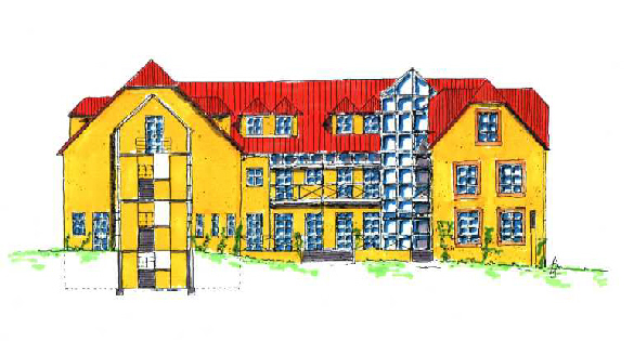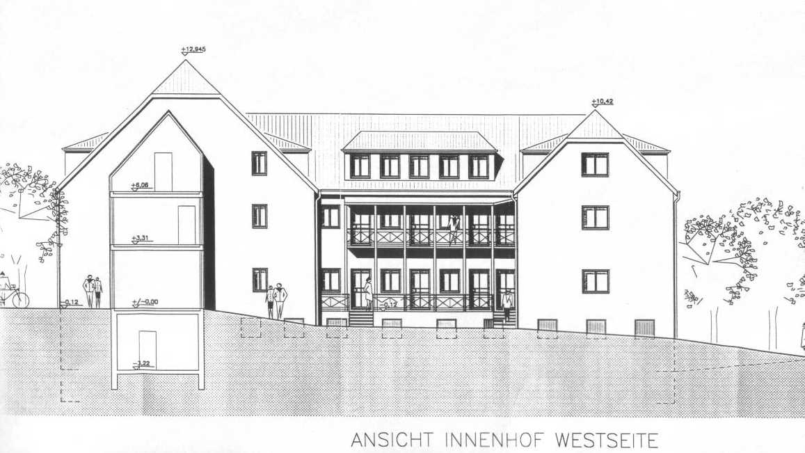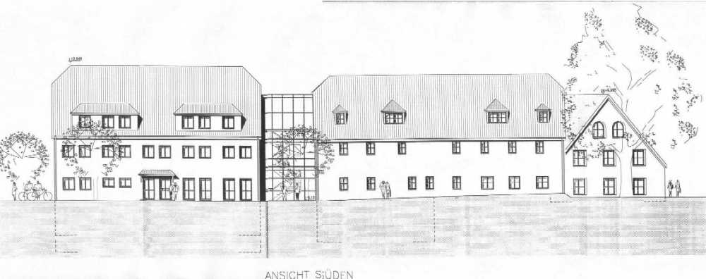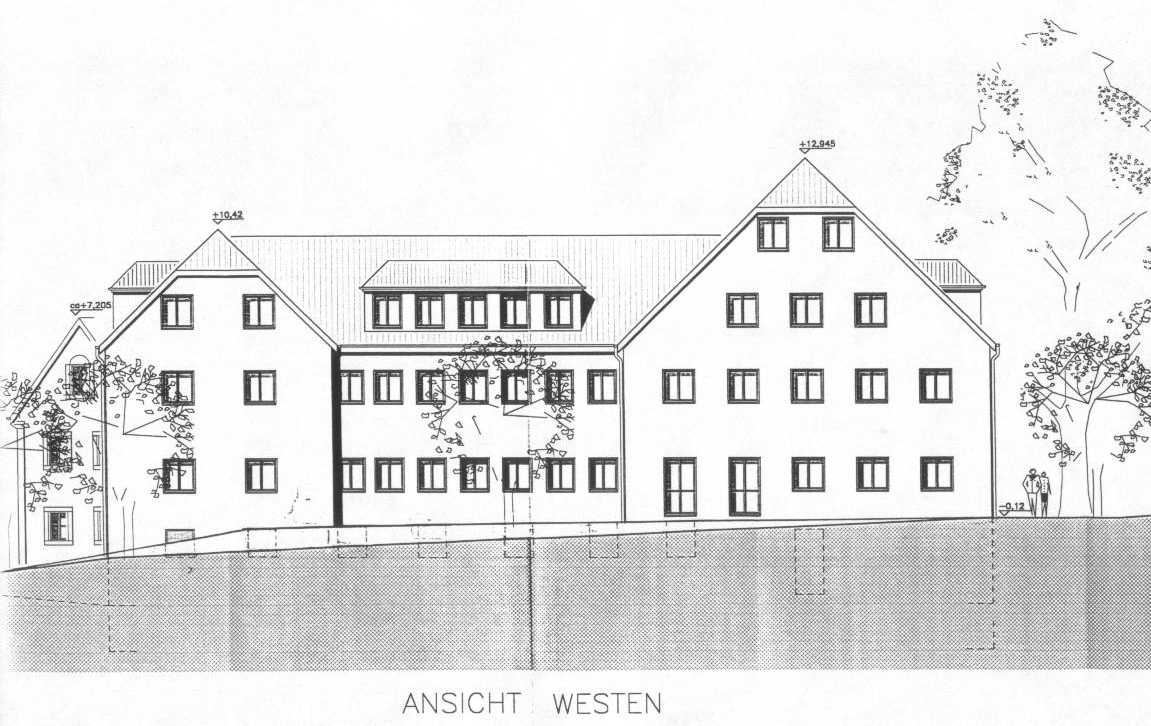 Ansicht Westseite mit Verbindungstreppenhaus Alt-, Neubau links Zugang zur Traditionskneipe |