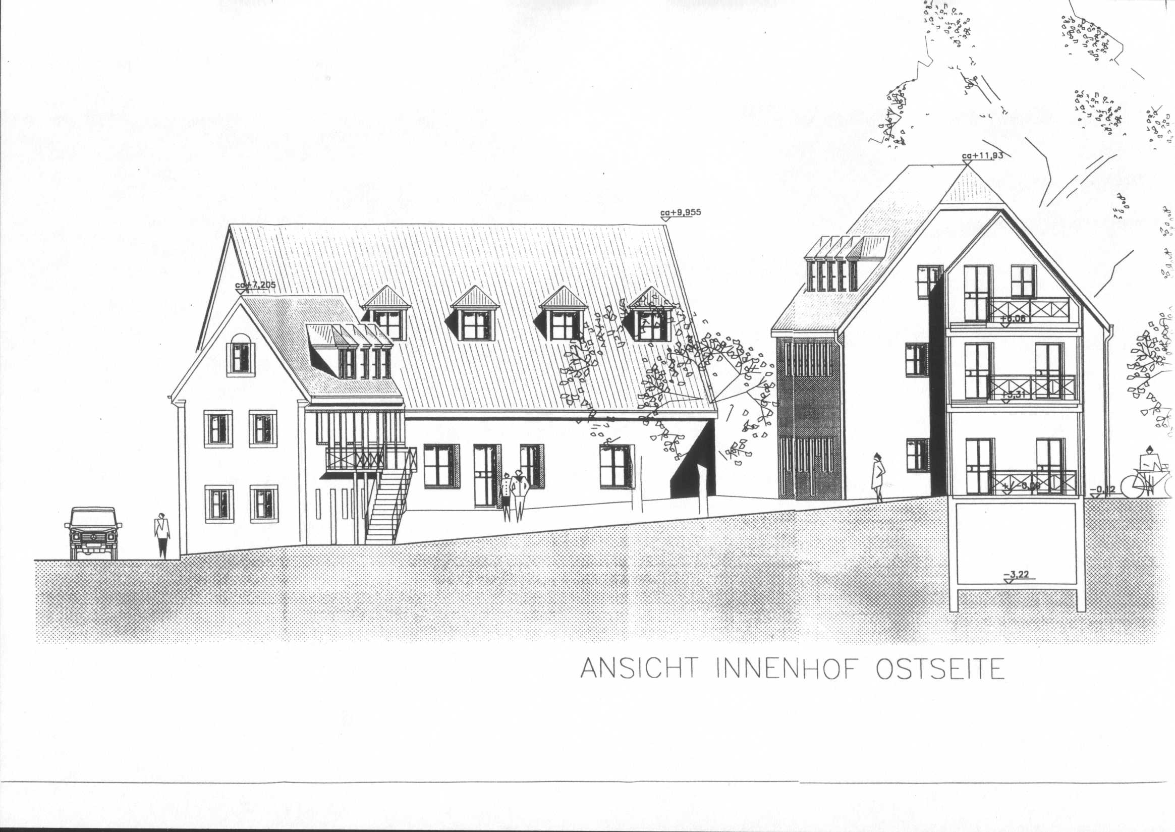 Ansicht Innenhof Südseite mit Treppenhausverbindung Alt- , Neubau und Schnitt durch den Neubau mit Tiefgaragenebene |