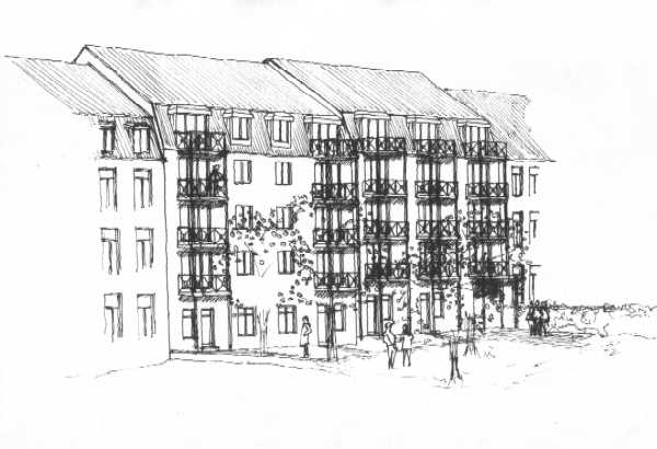 Entwurf eines Mehrfamilienhauses in einem alten Stadtzentrum in Dresden mit der Auflage, sich den denkmalerischen Gegebebenheiten anzupassen |