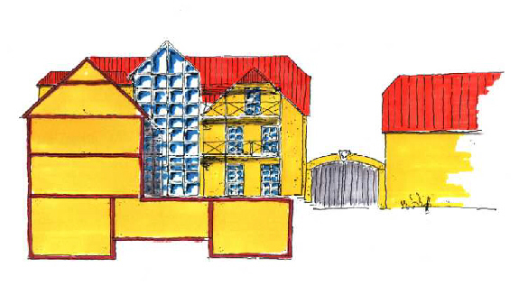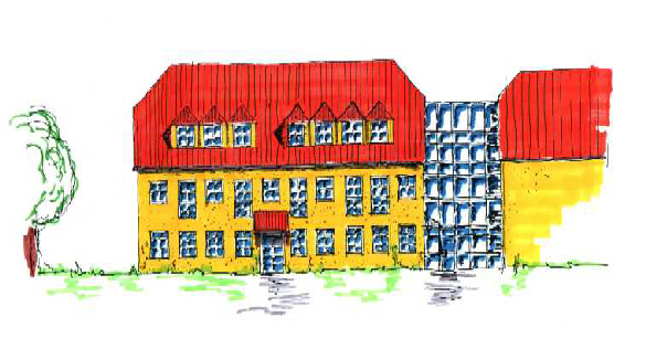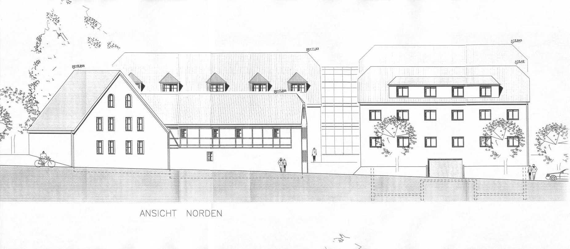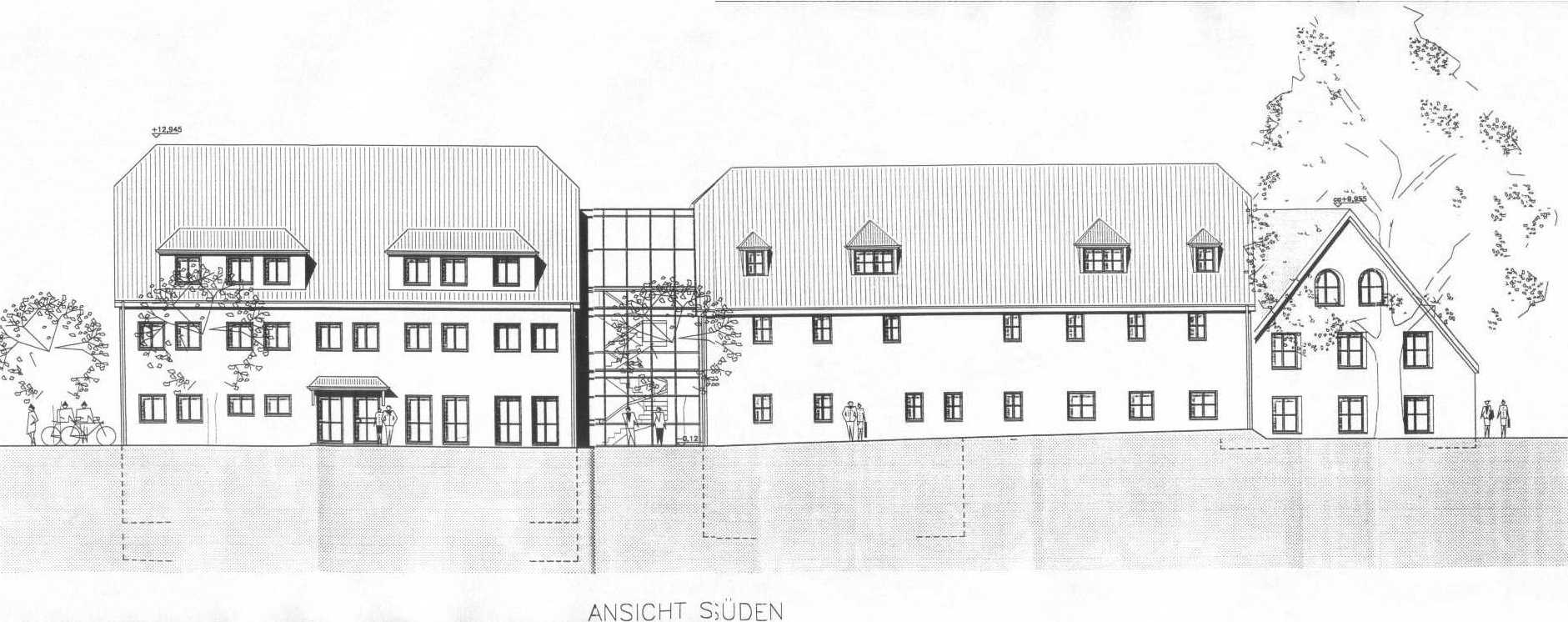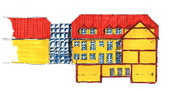 Ansicht Westseite mit Verbindungstreppenhaus Alt-, Neubau links Zugang zur Traditionskneipe |