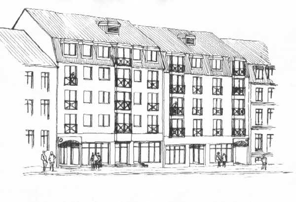 Entwurf eines Mehrfamilienhauses in einem alten Stadtzentrum in Dresden mit der Auflage, sich den denkmalerischen Gegebebenheiten anzupassen |