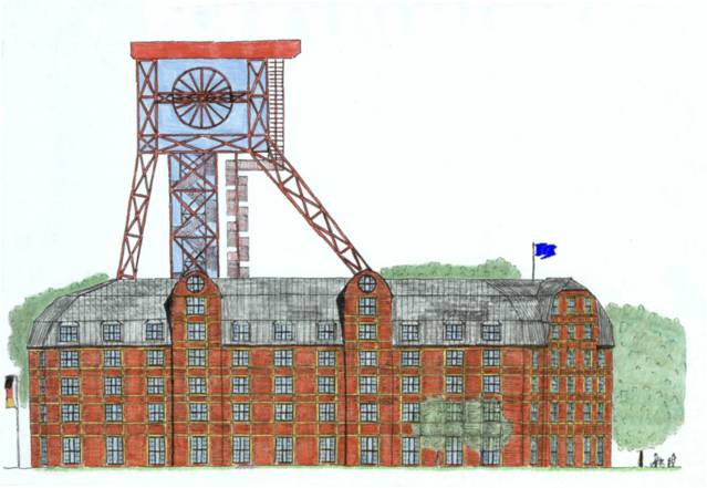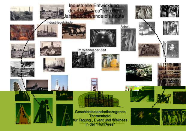Nach Durchschreiten des Hoteleinganges oder des Restauranteinganges empfängt den Gast eine der Welt des Bergbaus nachempfundenen Eingangsbereich der „Kumpel“ [ Bezeichnung für einen Bergmann im Ruhrgebiet unter Tage ] ( Stempeluhr , Hängebank [ Bereich über mehrere Ebenen vor dem Förderkorb zur Personenbeförderung] ) und der Führungsebene eines Bergwerkes ( Dies wird durch technische Konstruktion, Dekoration und Wandmalereien verdeutlicht ).
